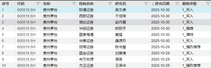 具体来看,国泰海通给予“增持”评级,该机构表示茅台迈向高质量增长阶段。财通证券表示,茅台第四季度批价有望探底回升。西部证券表示,今年前三季度茅台回款能力是行业独一档,茅台酒销售表现稳健。华创证券预判“2025年四季度或将迎供需第一个拐点”。