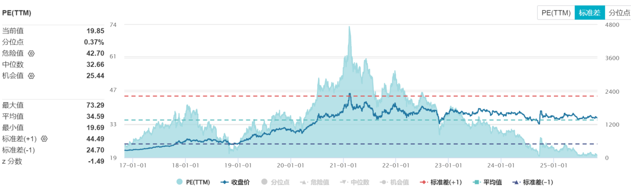 长期持有茅台的知名投资人段永平,于 2025年1 月、10月两次公开表示“买入茅台”,而其加仓逻辑恰与当前茅台的估值特征匹配:截至最新数据,茅台PE(TTM)当前值19.85,分位点仅0.37%,低于机会值25.44,接近历史最小值19.69,“估值底”特征显著。