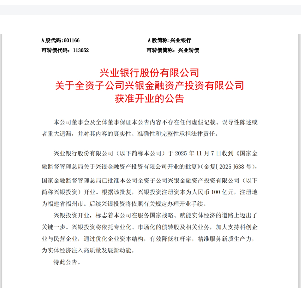 11月10日,兴业银行发布公告称,公司于2025年11月7日收到《国家金融监督管理总局关于兴银金融资产投资有限公司开业的批复》(金复〔2025〕638号),国家金融监督管理总局已批准本公司全资子公司兴银金融资产投资有限公司(以下简称兴银投资)开业。
