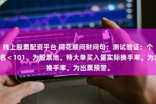 0930使用问财问句:非st,主板,创业板,股价>均价,竞价涨停取反,个股热度排名-2.2,分时特大单买入量/自由流通股*100>0.5, 0931使用问财问句:非st,主板,创业板,股价>均价,竞价涨停取反线上股票配资平台,个股热度排名-2.2线上股票配资平台,分时特大单买入量/自由流通股*100>0.5,(分时特大单买入量-一分钟前分时特大单买入量)/自由流通股*100>=0.05,0932使用问财问句:非st,主板,创业板,股价>均价,竞价涨停取反,个股热度排名-2.2,分时特大单买入量/自由流通股*100>0.5,(分时特大单买入量-一分钟前分时特大单买入量)/自由流通股*100>=0.05,(一分钟前分时特大单买入量-二分钟前分时特大单买入量)/自由流通股*100>0.05,0933使用问财问句:非st,主板,创业板,股价>均价,竞价涨停取反,个股热度排名-2.2,分时特大单买入量/自由流通股*100>0.5,(分时特大单买入量-一分钟前分时特大单买入量)/自由流通股*100>=0.05,(一分钟前分时特大单买入量-二分钟前分时特大单买入量)/自由流通股*100>0.05,(二分钟前分时特大单买入量-三分钟前分时特大单买入量)/自由流通股*100>0.05,0934使用问财问句:非st,主板,创业板,股价>均价,竞价涨停取反,个股热度排名-2.2,分时特大单买入量/自由流通股*100>0.5,(分时特大单买入量-一分钟前分时特大单买入量)/自由流通股*100>=0.05,(一分钟前分时特大单买入量-二分钟前分时特大单买入量)/自由流通股*100>0.05,(二分钟前分时特大单买入量-三分钟前分时特大单买入量)/自由流通股*100>0.05,(三分钟前分时特大单买入量-4分钟前分时特大单买入量)/自由流通股*100>0.05935-1500使用同花顺 问财问句:非st,主板,创业板,股价>均价,股价-2.2,分时特大单买入量/自由流通股*100>0.5,(一分钟前分时特大单买入量-二分钟前分时特大单买入量)/自由流通股*100>0.05,(二分钟前分时特大单买入量-三分钟前分时特大单买入量)/自由流通股*100>0.05,(三分钟前分时特大单买入量-4分钟前分时特大单买入量)/自由流通股*100>0.05,(4分钟前分时特大单买入量-5分钟前分时特大单买入量)/自由流通股*100>0.05。以上为测试问句,不是圣杯。以同花顺个股热度排名<101为股票池,使用特大单买入量/自由流通股大于多少为预警提醒。问句不知道是否写的正确,如有更好的写法请留言。以上问句可以使用同花顺动态分组后刷新。